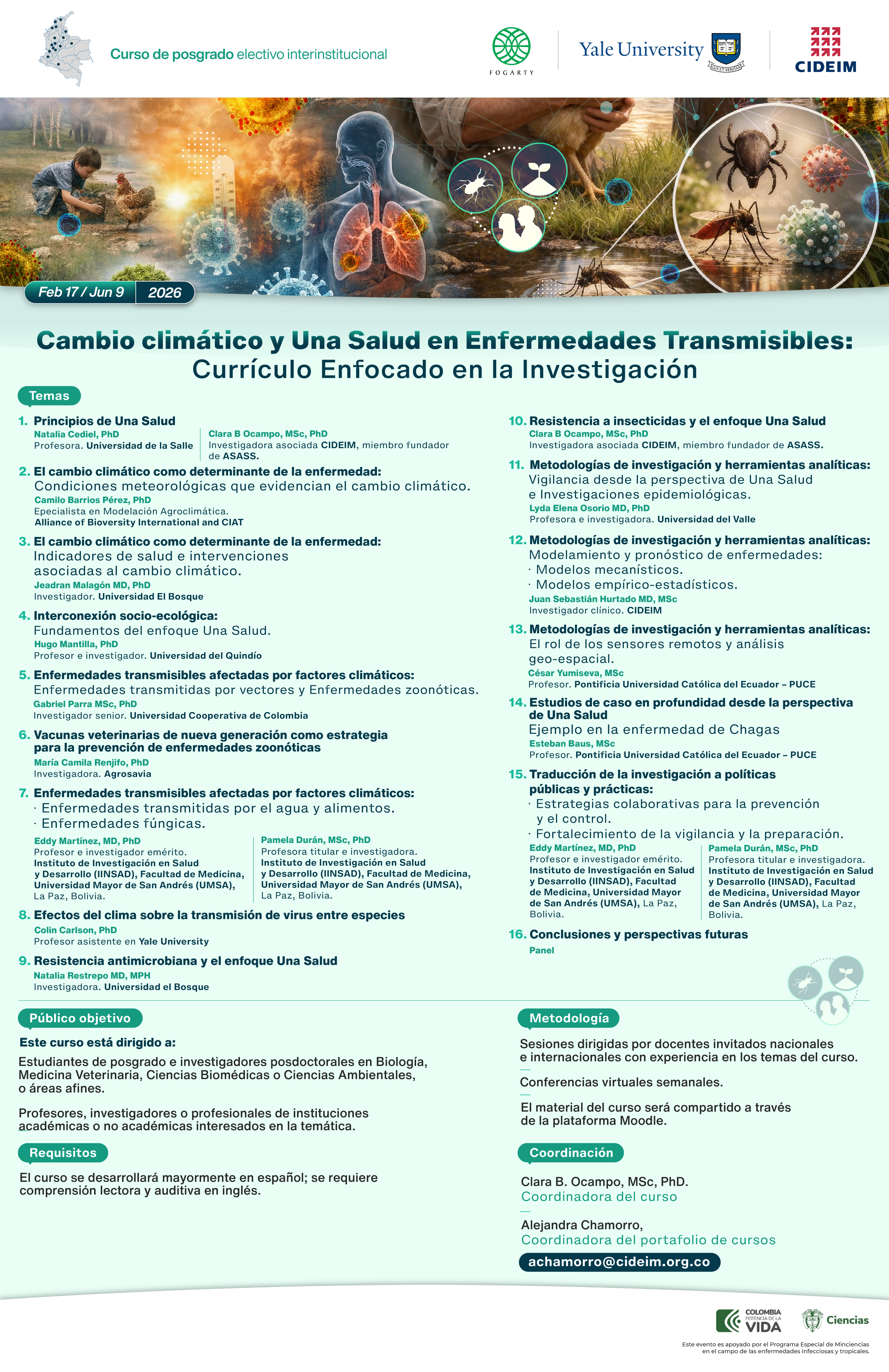 Este curso de nivel de posgrado está diseñado para proporcionar a los estudiantes una comprensión integral de la compleja relación entre el clima, los ecosistemas y las enfermedades transmisibles desde el enfoque del paradigma de Una Salud (One Health).