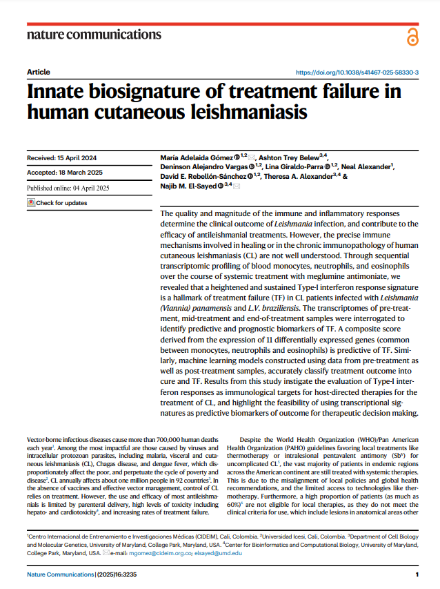 Acceda al artículo “Innate biosignature of treatment failure in human cutaneous leishmaniasis” en el siguiente enlace: https://doi.org/10.1038/s41467-025-58330-3